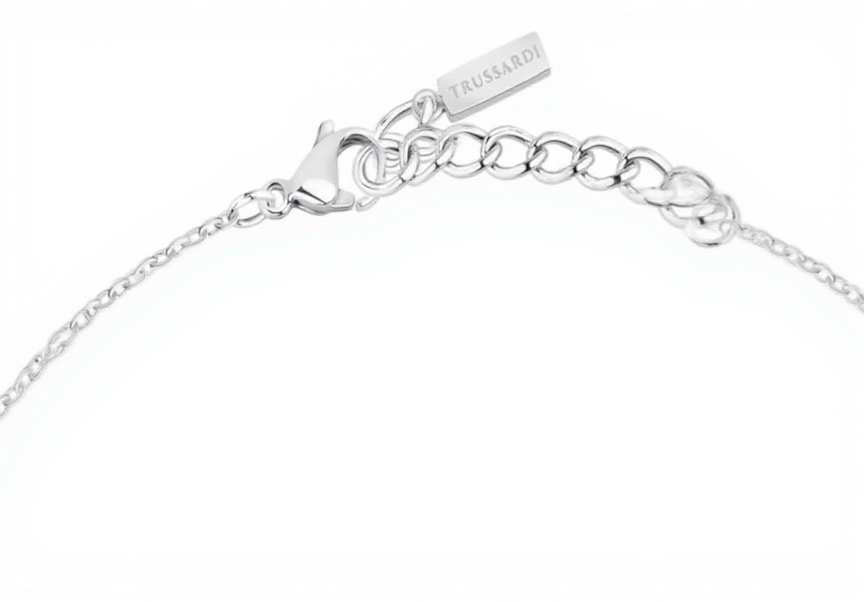 La collana Trussardi T-Logo è realizzata in acciaio inossidabile di alta qualità, abbellita da zirconi che esaltano il design distintivo. Presenta il caratteristico elemento a T, simbolo del marchio, e una chiusura a moschettone per una vestibilità sicura e facile da indossare.