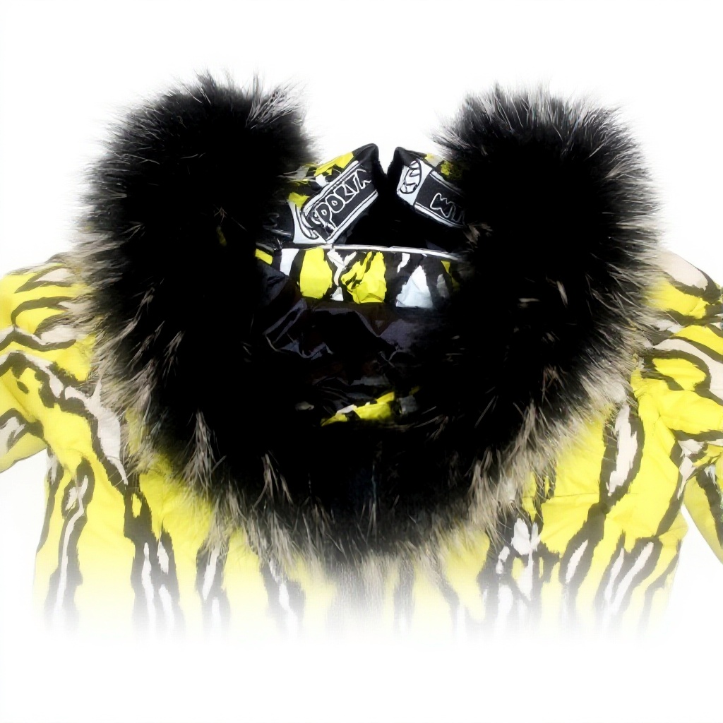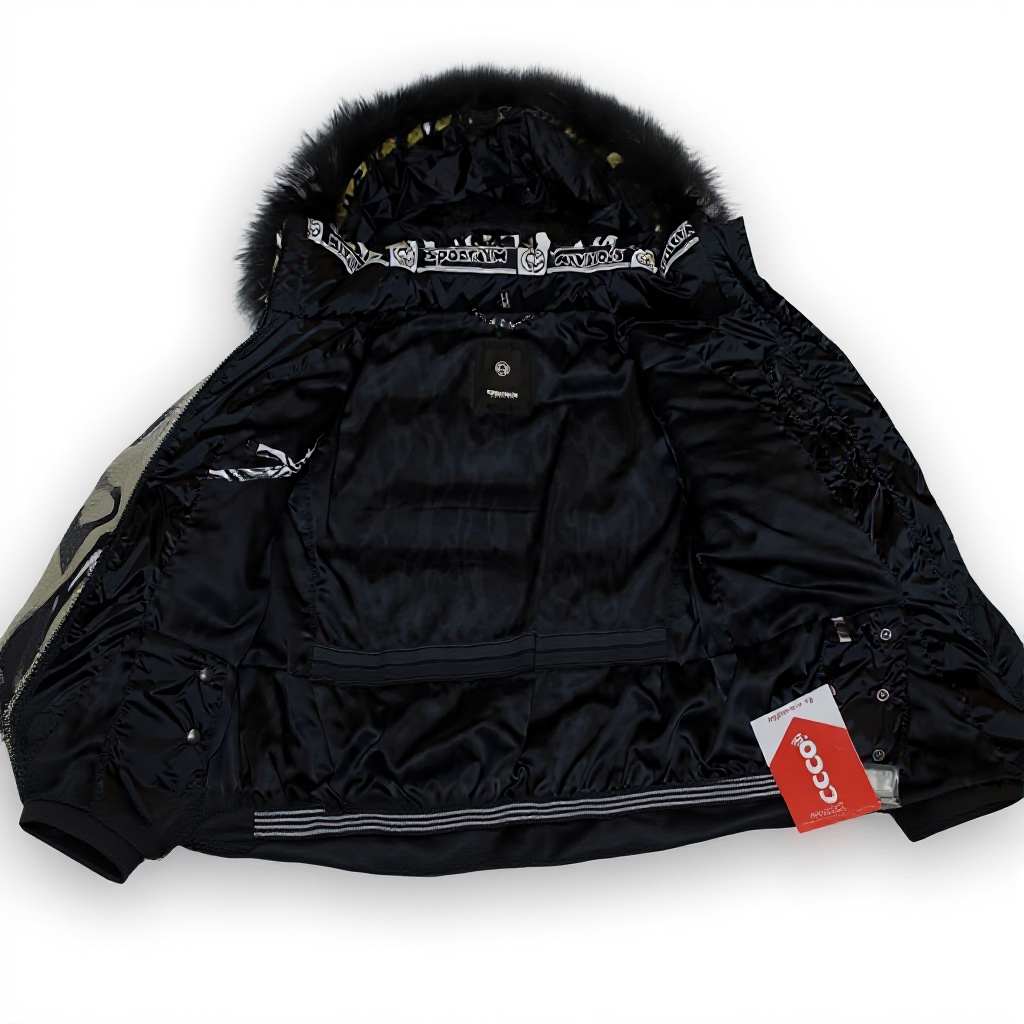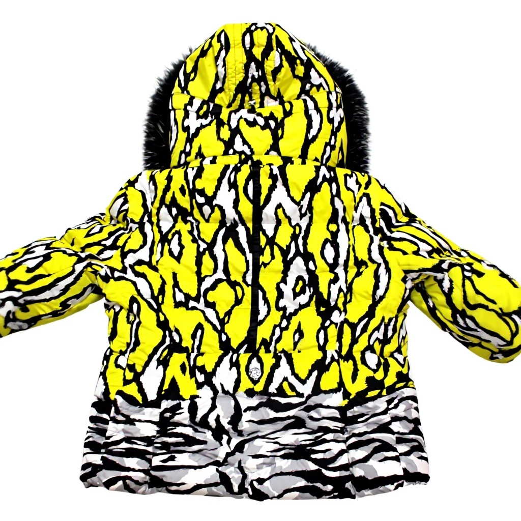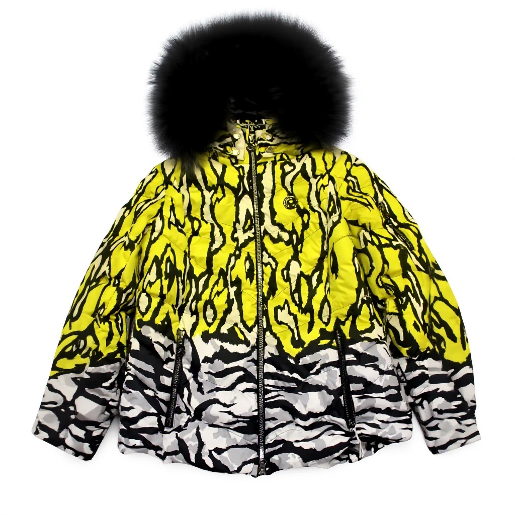 La giacca include una stampa in vera pelliccia e imbottitura in Finnragragoon, materiali noti per leggerezza e isolamento termico.